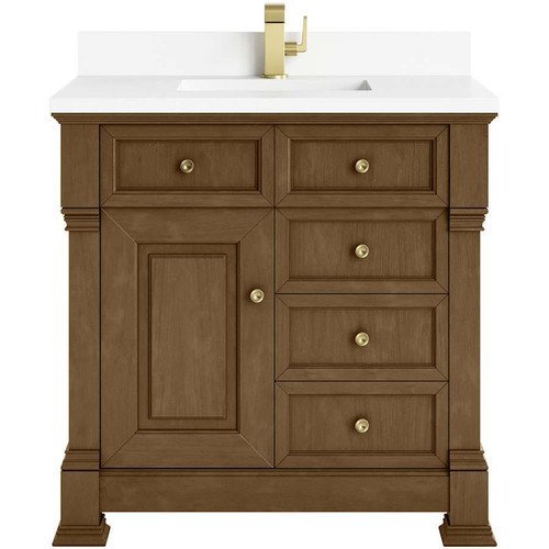 The Brookfield 36" Single Vanity by James Martin Vanities offers a blend of traditional elegance and contemporary sophistication. The raised panel picture frame doors and detailed corner molding reflect timeless craftsmanship, while the rich finish and hardware lend a fresh, modern appeal. This beautifully crafted vanity features a single-door cabinet with an interior shelf, a double-height drawer for added versatility, and two standard drawers for ample storage. The timeless finish lends sophistication and charm to your space. The vanity is completed by a classic top and backsplash with undermount sink.